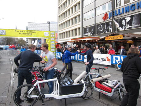 Dann gab es am Freitag Mittag, direkt zu Beginn des E-Bike Festivals das 2. Dortmunder Lastenradrennen inkl. Fahrerlager, welches Axel und Fabian von der VeloKitchen vorberietet und durchgeführt haben.