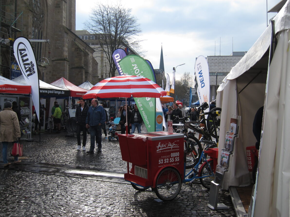 Dann wurde der Gemeinschaftsstand direkt am Pylon an der Reinoldikirche aufgebaut und für die Besuchermassen hergerichtet. Mit am Stand waren VCD, ADFC, dobeq, Agendaarbeitskreise Nachaltige Mobilität, Umwelt und Teifbauamt und HELFI.